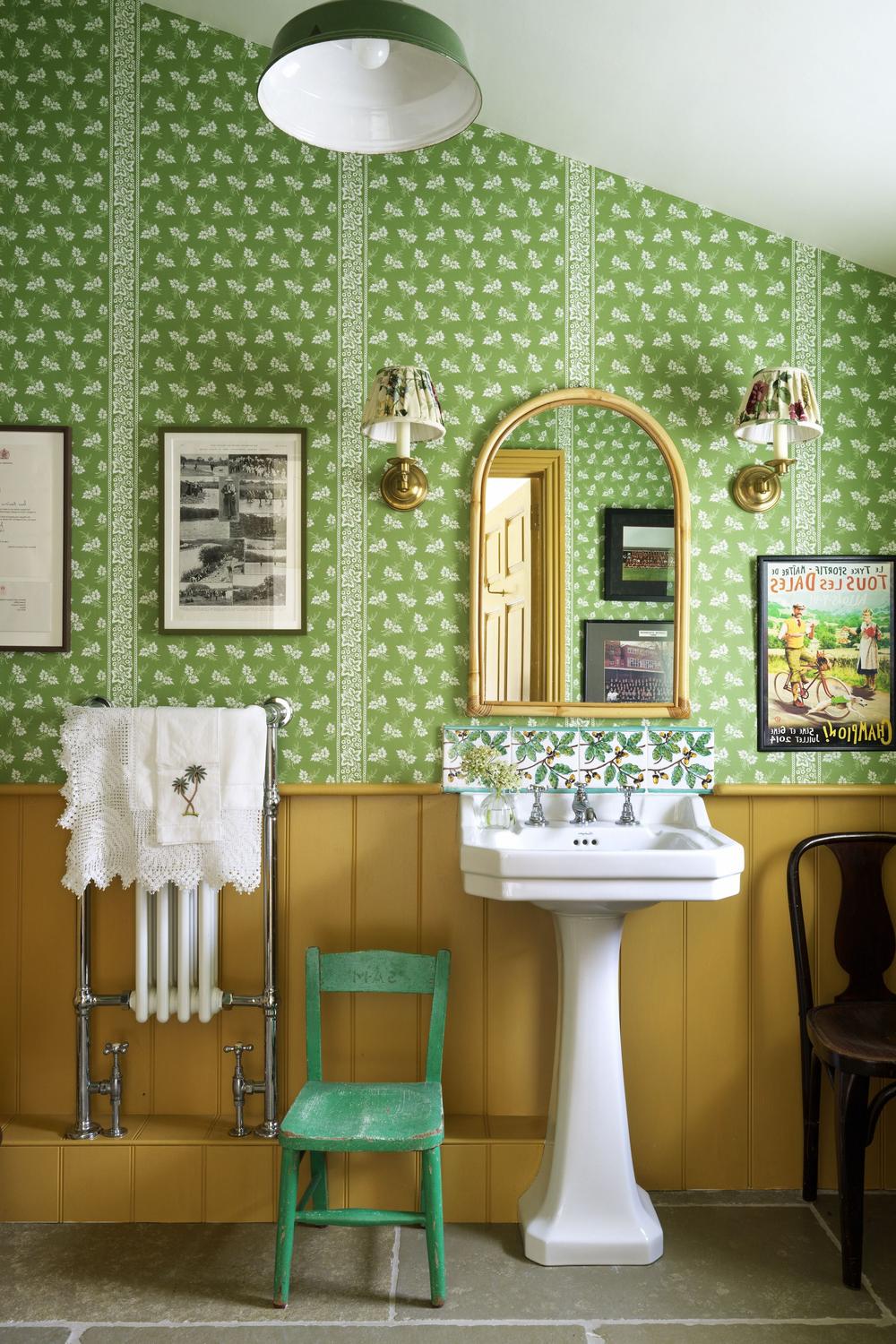 Este encantador baño vintage está enmarcado por un hermoso papel pintado floral verde que aporta vida y alegría al espacio. La parte inferior de la pared, en un cálido amarillo mostaza, crea un contraste acogedor con el papel pintado y añade un aire rústico. Un lavabo blanco de pedestal se erige como el punto focal, acentuado por grifos de plata que evocan la elegancia de tiempos pasados.