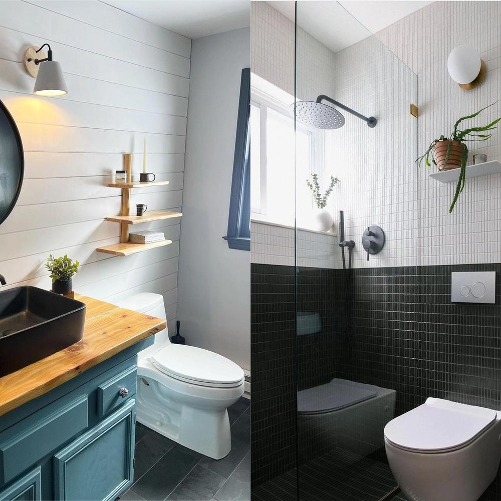La iluminación y los accesorios también son importantes, como se muestra en ambas secciones: simples estanterías de madera decoradas añaden un toque natural a la pieza, mientras que el espejo redondo negro del lado tradicional da sensación de amplitud y modernidad. Si estas ideas te inspiran, comienza a pensar en cómo podrías implementar algunas en tu propio baño de invitados.