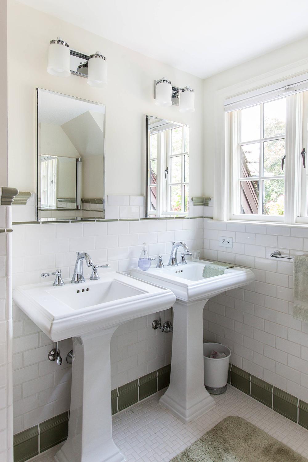 Este encantador baño resalta con sus dos lavabos pedestal blancos, que aportan un diseño clásico y elegante. Los espejos rectangulares estampan una sensación de amplitud mientras que el rodapié de azulejos en verde suave añade un detalle de color que complementa el tono neutro de los azulejos blancos en las paredes. La iluminación suave proveniente de los apliques de pared acentúa la calidez del espacio, generando un ambiente acogedor.