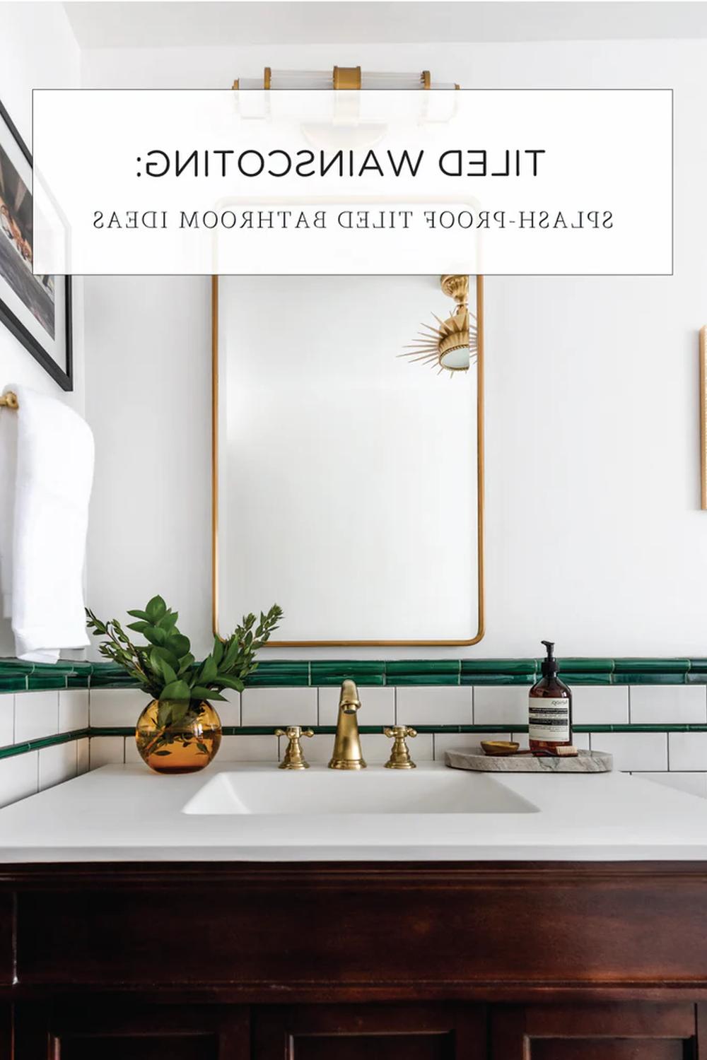En este baño, el alféizar de cerámica verde se combina a la perfección con la pintura blanca de la parte superior. La mezcla de azulejos decorativos en la parte inferior añade personalidad al espacio. El mueble de baño de madera oscura con una encimera blanca y un lavabo rectangular integrado proporciona un contraste elegante.