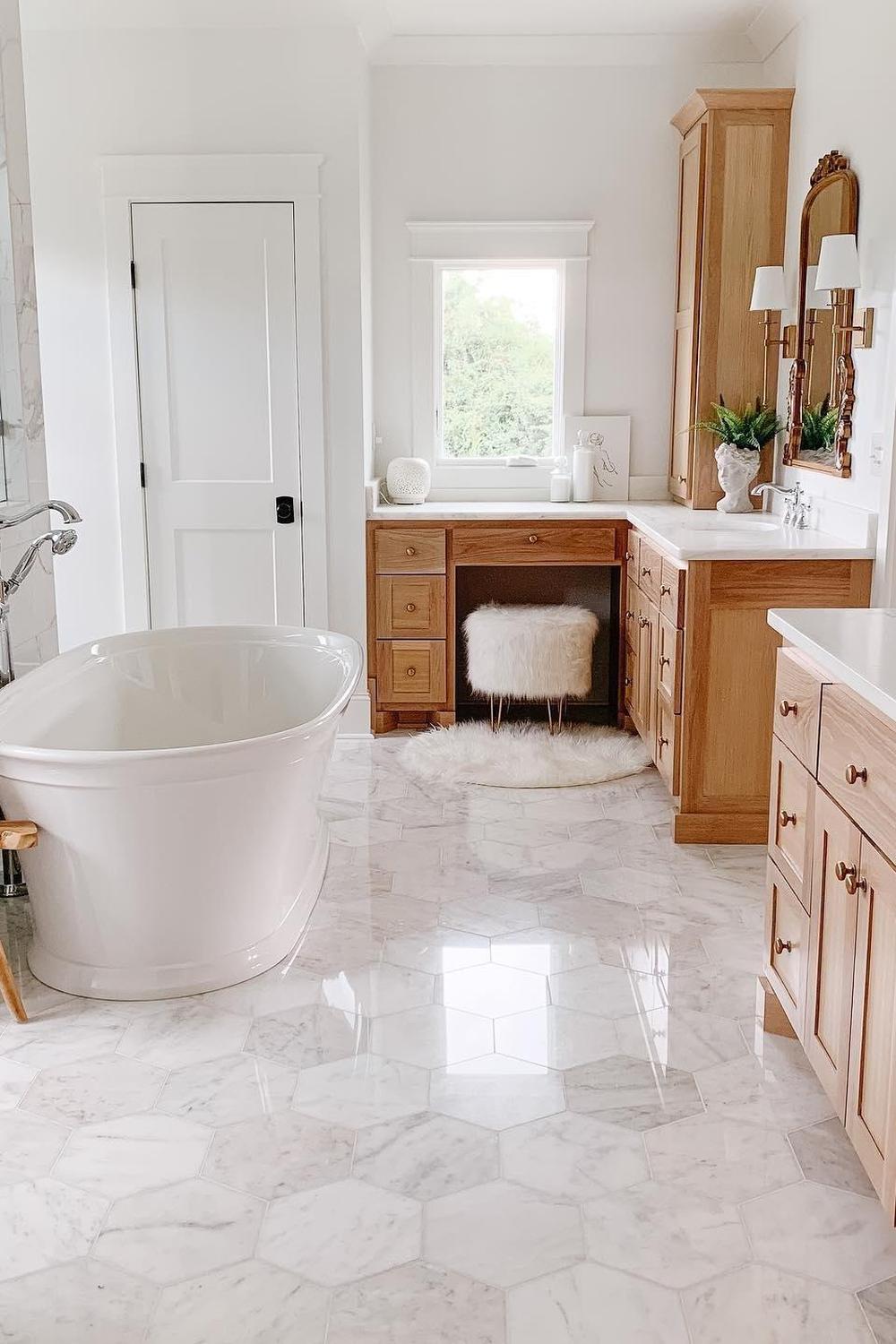 Este elegante baño destaca por su suelo de baldosas hexagonales blancas con un patrón de mármol claro que refleja la luz, creando una atmósfera luminosa y serena. A la izquierda, una bañera exenta blanca se convierte en el punto focal, aportando curvas suaves que evocan un estilo minimalista y relajante.
